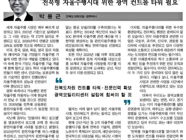 ‘전북형 자율주행시대’를 맞이하기 위한 도차원의 컨트롤 타워와 전문인력 확보 그리고 광역교통정보센터를 넘어 광역모빌리티센터 설립에 힘써야 할 것이다.