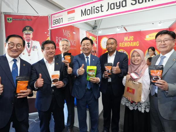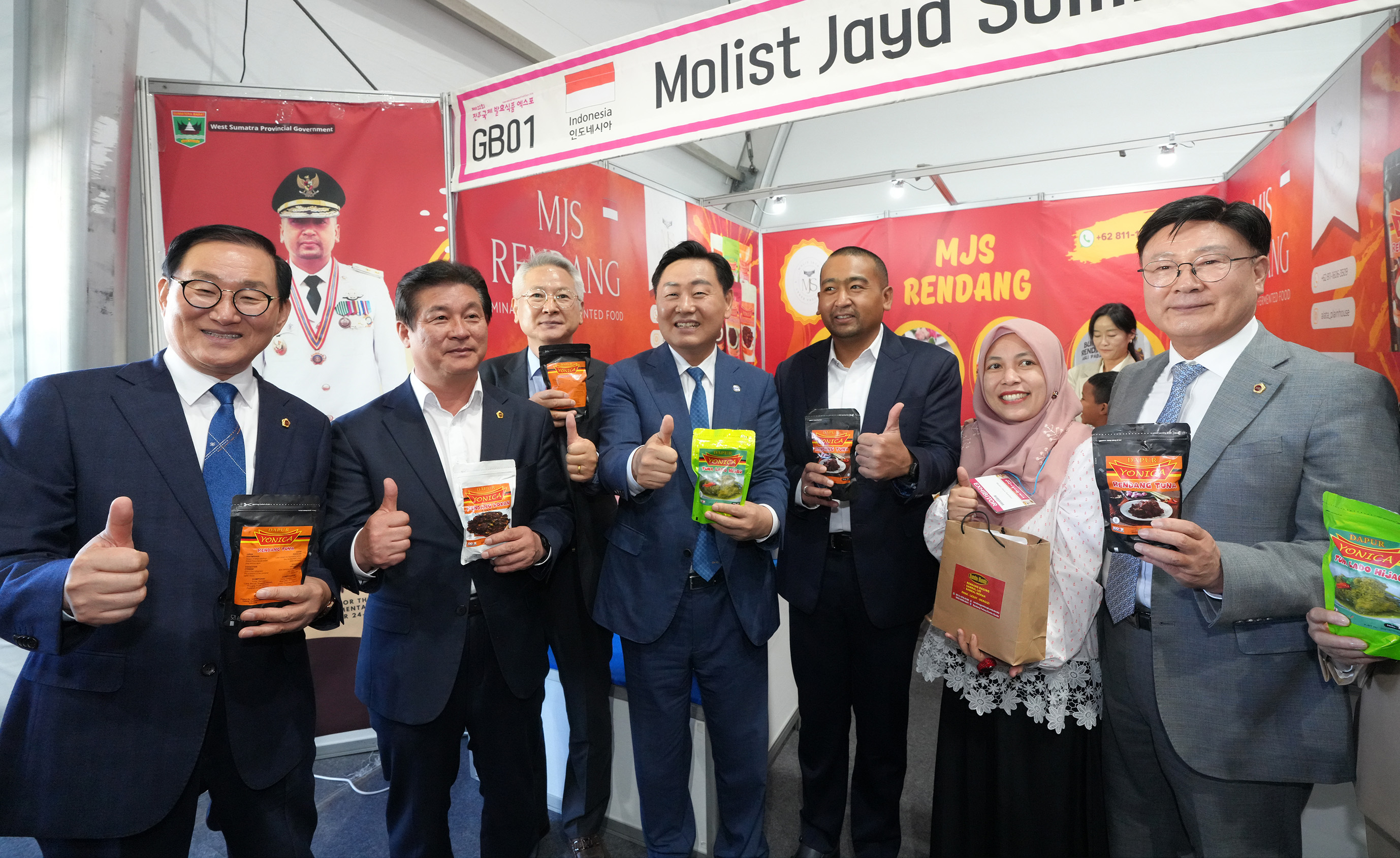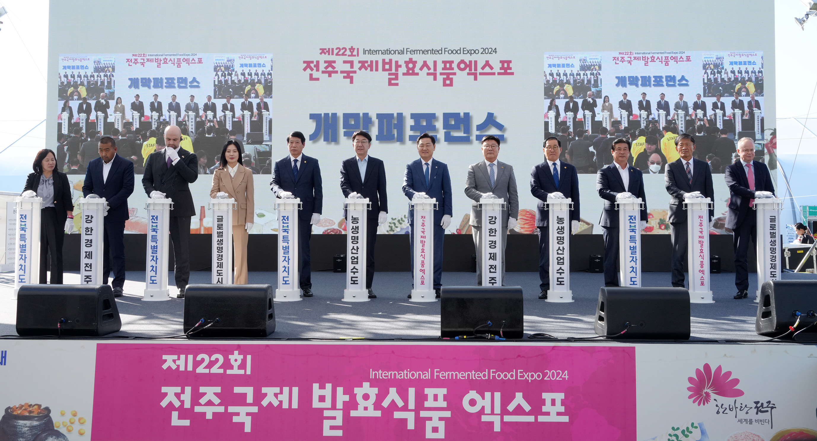 24일 전북 전주시 월드컵경기장 특설무대에서 열린 제22회 전주국제발효식품엑스포 개막식에서 문승우 의장과 임승식 농업복지환경위원장, 최형열 기획행정위원장, 김정수 의원이 퍼포먼스를 한 뒤 김관영 도지사와 함께 행사장 라운딩을 하고 있다.