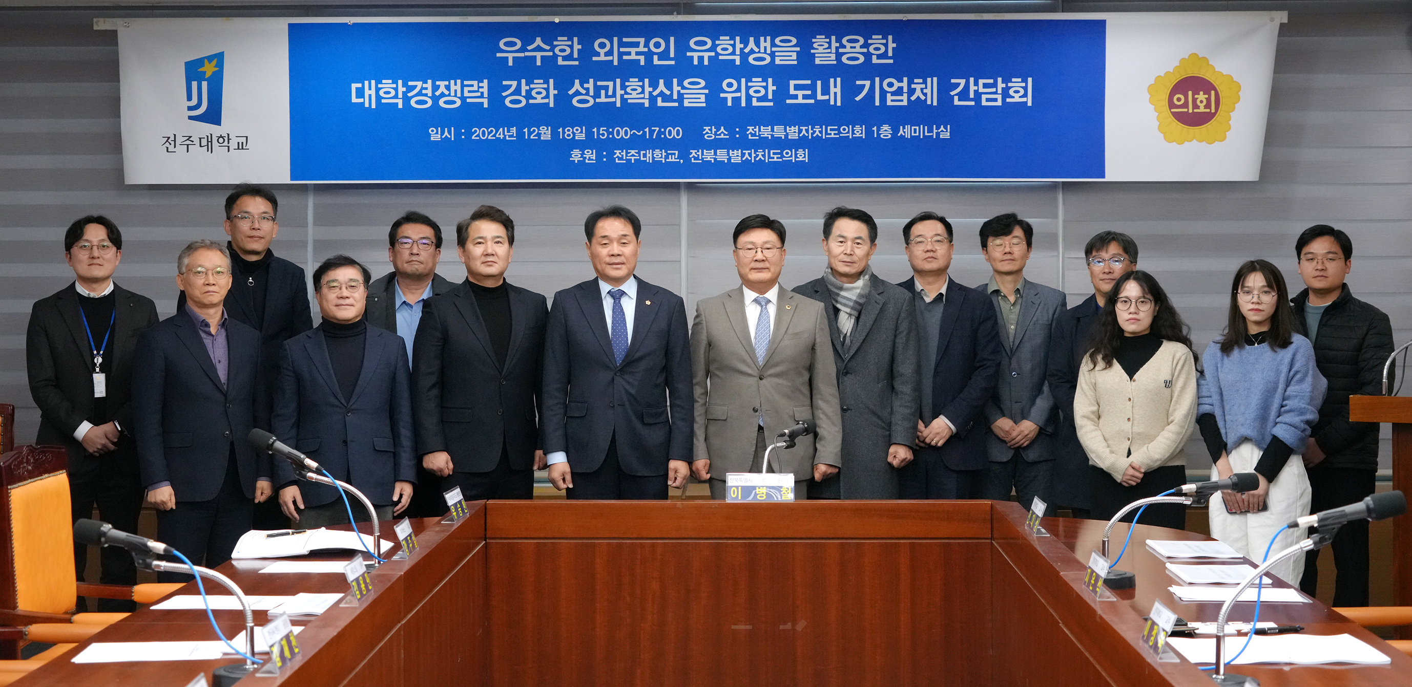 18일 전북 전주시 전북특별자치도의회 세미나실에서 열린 외국인유학생 활용 간담회에 참석한 문승우 의장과 주최한 이병철 의원, 전용태 의원이 참석자들과 기념촬영을 하고 있다.